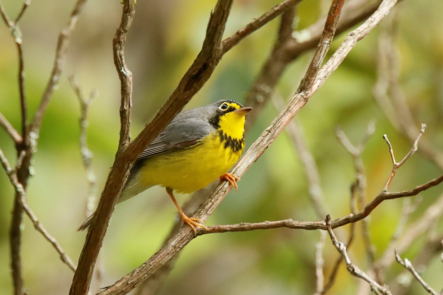 Here’s a Canada Warbler from a previous year, just to show you how stunning these little birds are–when you are fortunate to actually catch a glimpse of them! Warblers are fairly small birds, they’re often up high in the trees, and they dart about continually while foraging, so they can be really difficult to see.