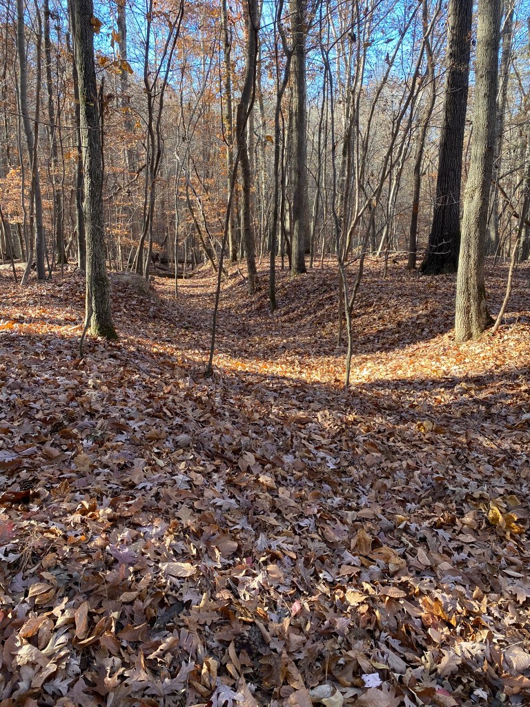 This depression used to be Fish Dam Road. Originally it was a Native American path, then a colonial era road that went from the Neuse River to Hillsborough.