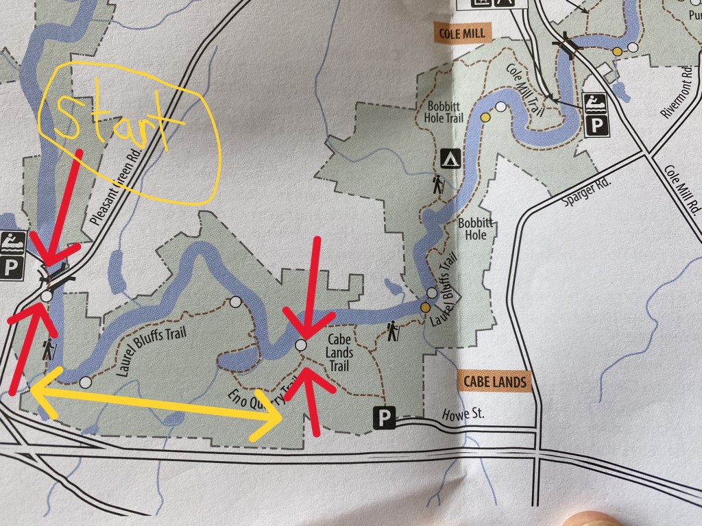 Segment 10 (eastbound) begins at Pleasant Green Road in Eno River State Park near Durham. The MST (white dot) runs together with the Laurel Bluffs Trail (yellow dot).