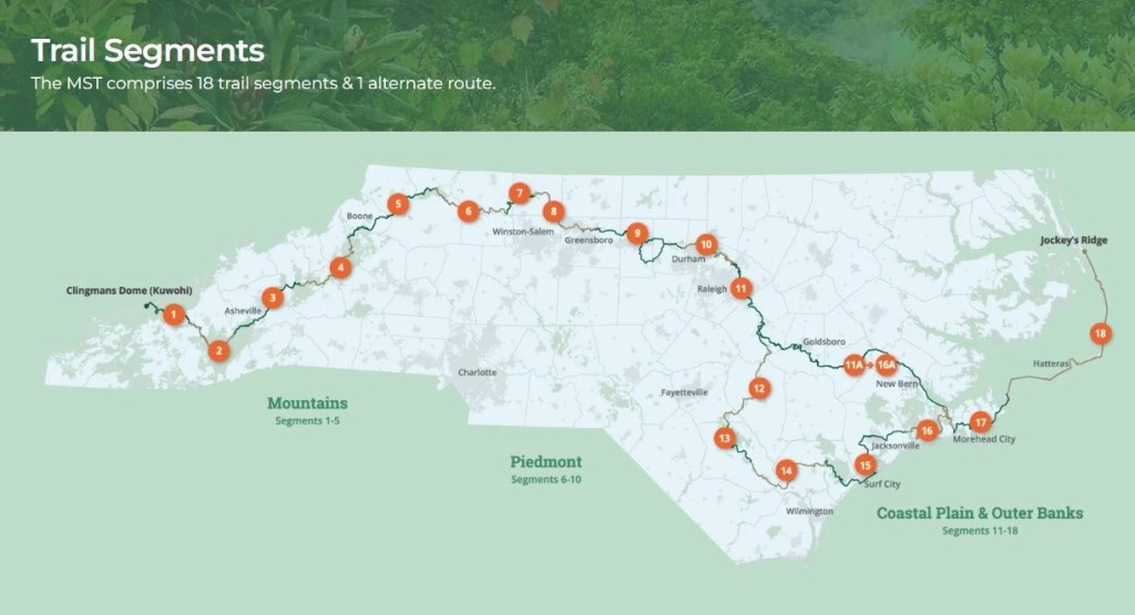 The MST stretches 1175 miles from the Great Smoky Mountains to the Outer Banks.