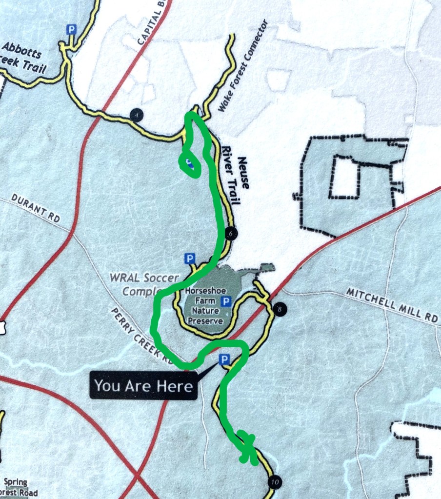 A couple of miles in, the MST left the Neuse River Trail and traversed through the WRAL soccer fields, then out to a busy road. It seemed like a strange detour.