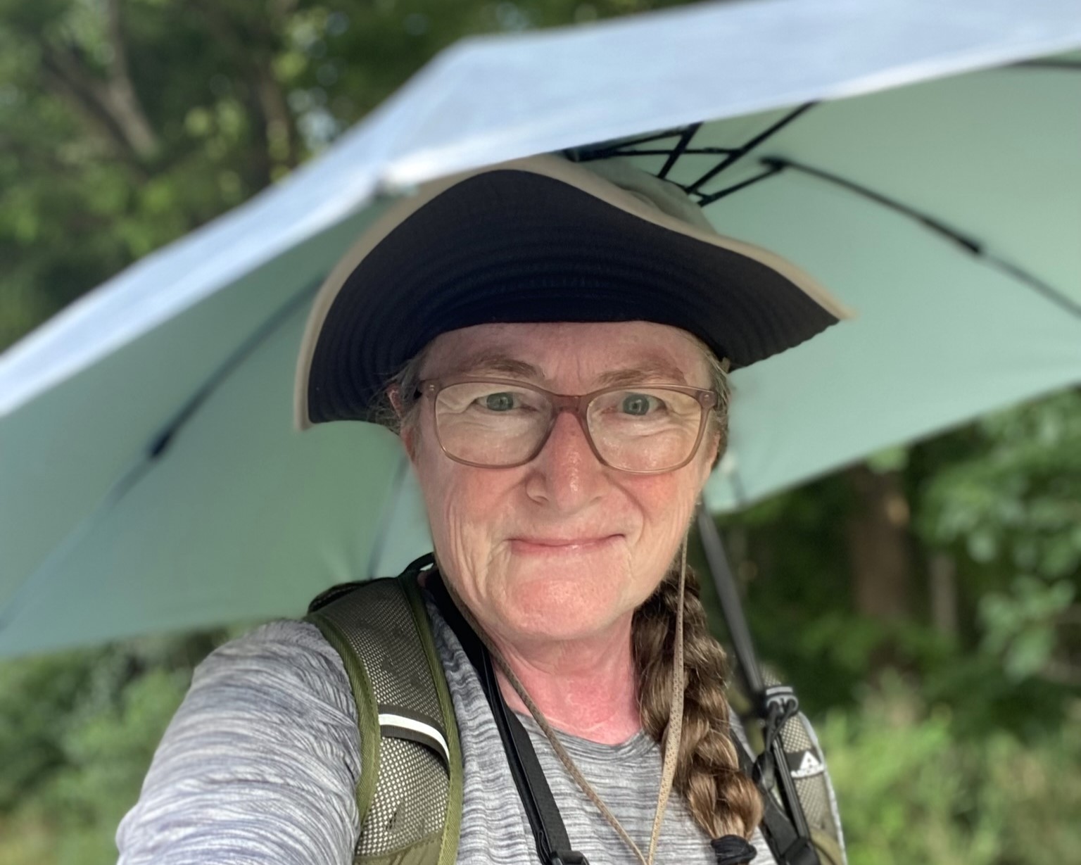 I tried attaching the solar umbrella to my backpack straps, to keep my hands free, but I didn’t really like the angle, so I removed it and have just been holding it. That works because I’m not using a walking pole on these road hikes.