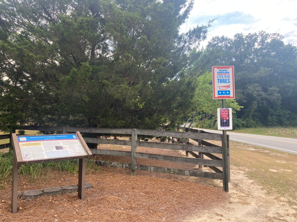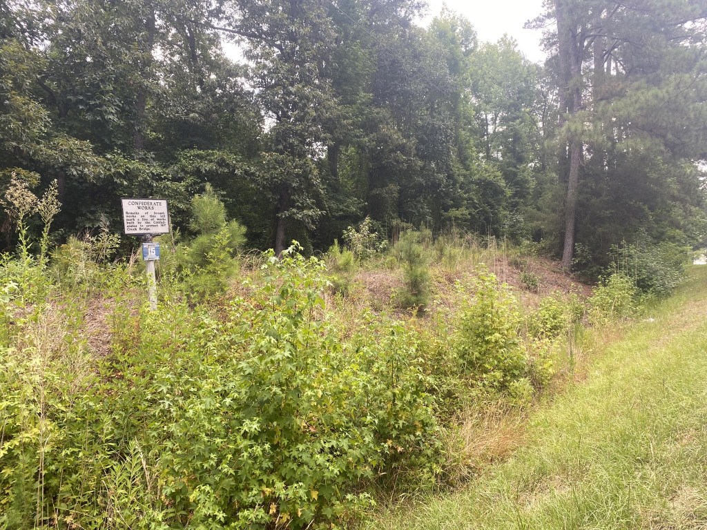 “Remains of breastworks on this hill mark a line built by the Confederates to protect Mill Creek Bridge.”