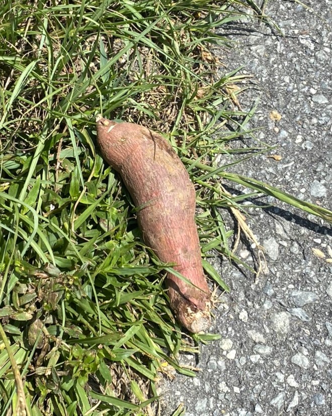 Far more charming than the usual roadside litter, my best guess is that the sweet potato truck hit a big bump.