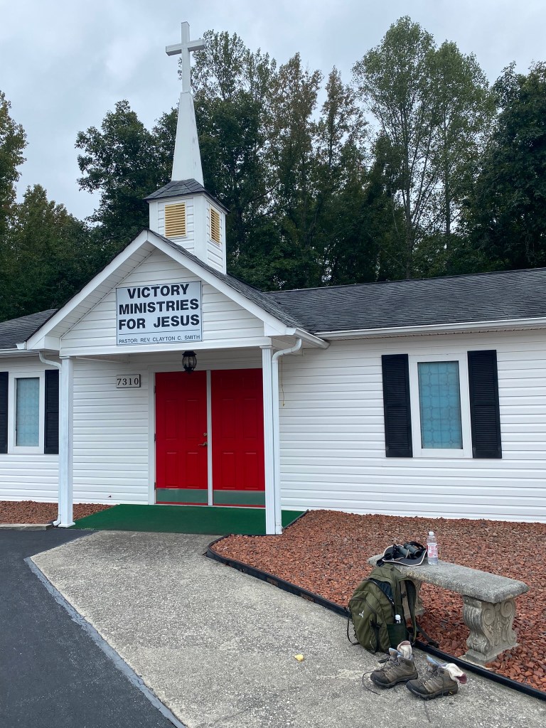 Around 12 miles I like to find a place to take a longer break, off my feet–and out of my boots–if possible. Thank you, Victory Ministries for Jesus, for your sweet little bench!