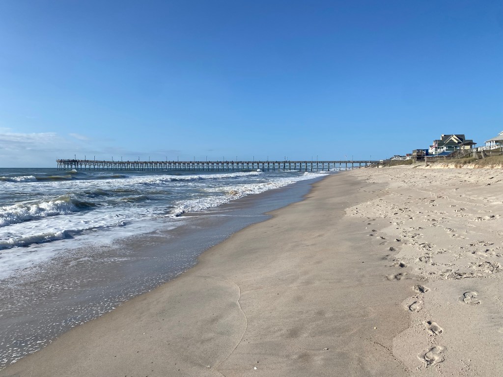 The Surf City Fishing Pier marks the end of my first nine miles. In the last two miles the tide was coming up and I had to walk on softer sand–kind of a slog. I was glad to finish up the beach portion of the hike.