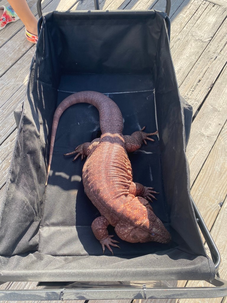 Boris enjoys the sun at the beach while attracting children to come hear the librarian’s assistant read a story.