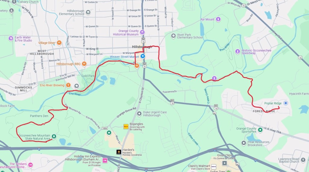 A neighbor said he recently walked from Occoneechee Mountain back to our neighborhood, and that sounded like a lot of fun. I combined this five-mile walk with two errands in downtown Hillsborough.