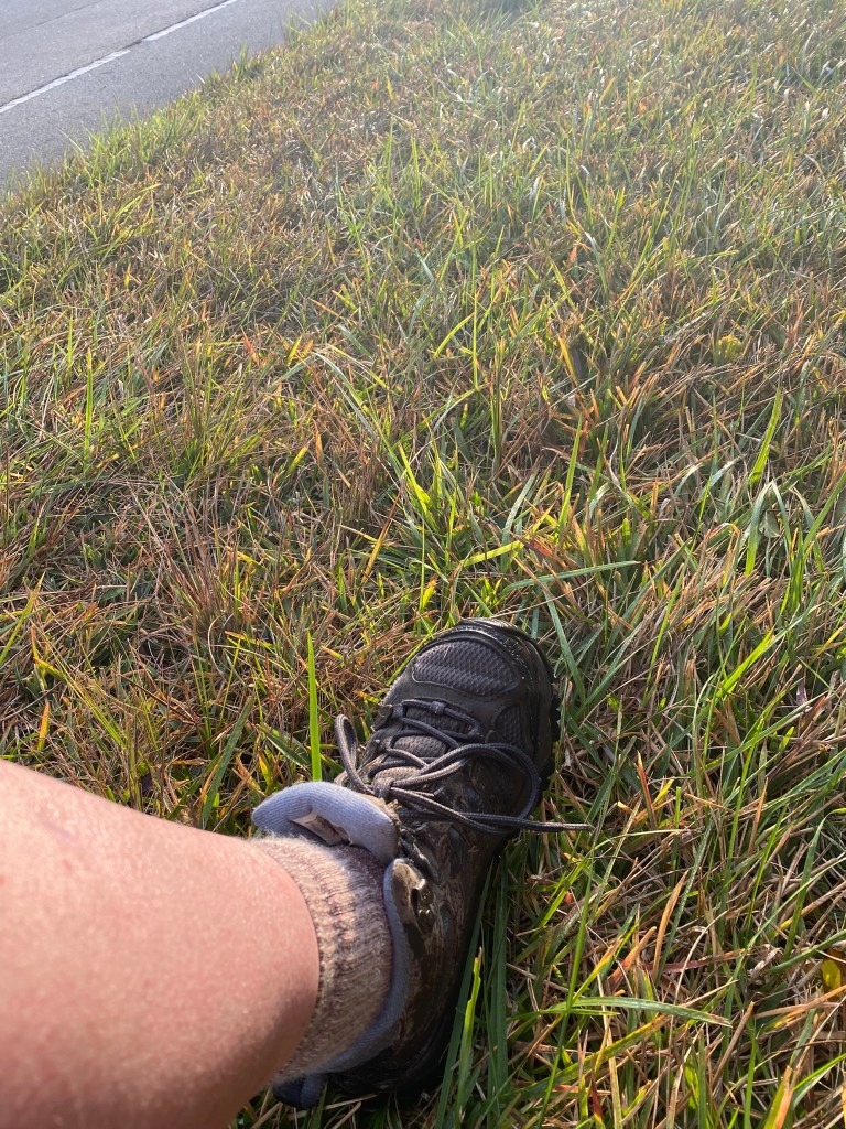 The broad shoulder of NC-24 was safe, but the grass was quite dewy, and I soaked through my “waterproof” boots.