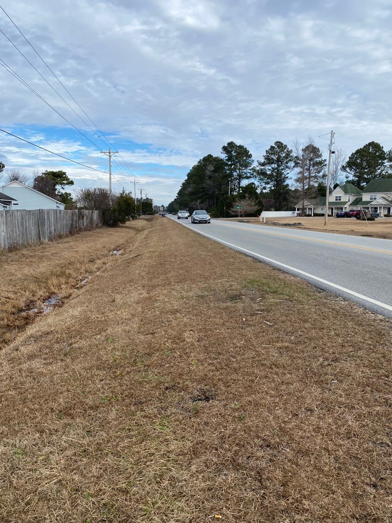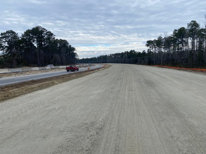 The shoulder was safe enough on US-70, but I continued straight on the road-in-progress.