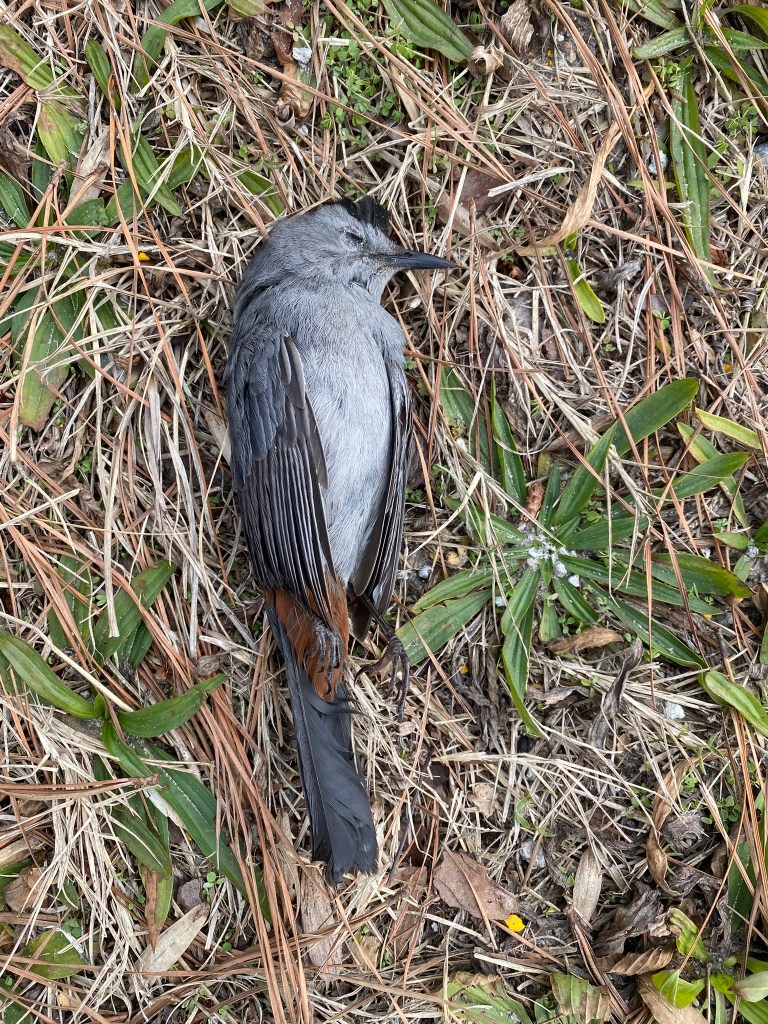 Sadly, another roadside still life. In this case, a Gray Catbird. I’m always sorry to see a dead bird, but it is an opportunity to see plumage and structure up close. The catbird has a spunky black cap and a rusty orange “vent” area.