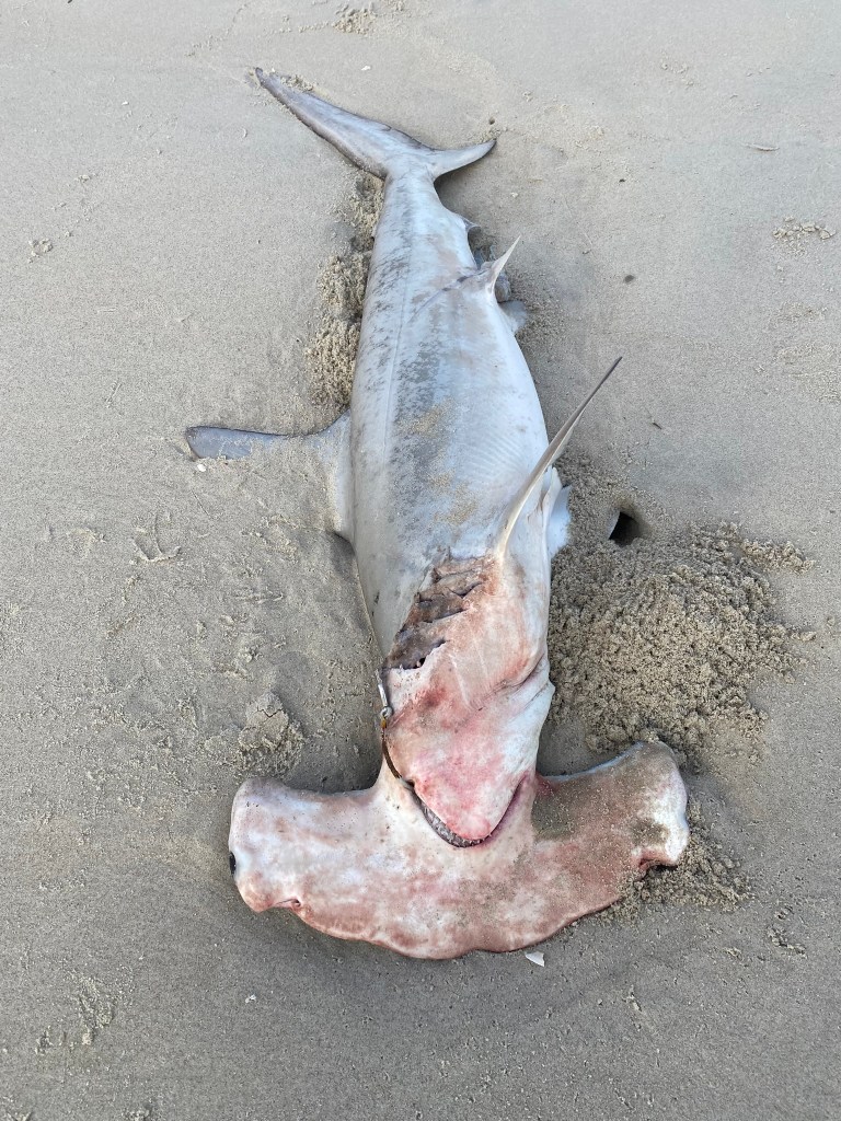 The Hammerhead Shark had a fishing lure in its mouth, so I guess it got hooked, then broke the line, and was injured in the process. Maybe?