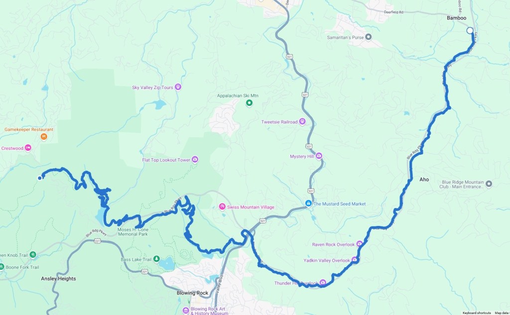 The route was often near the Blue Ridge Parkway and occasionally went along it for a short distance. Because there are so many hurricane-related BRP closures, there wasn’t a lot of traffic noise.