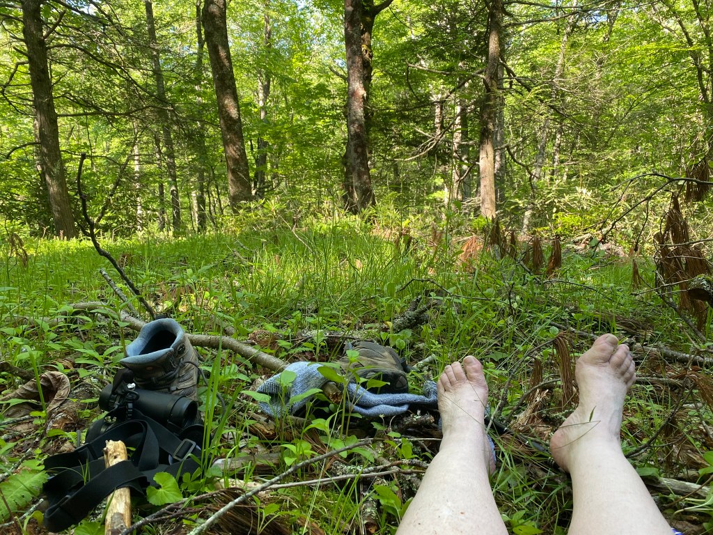 Halfway, and time for the shoes-off, dry socks break. (My shoes and socks got wet in the dewy cow pastures, not from the creeks!)
