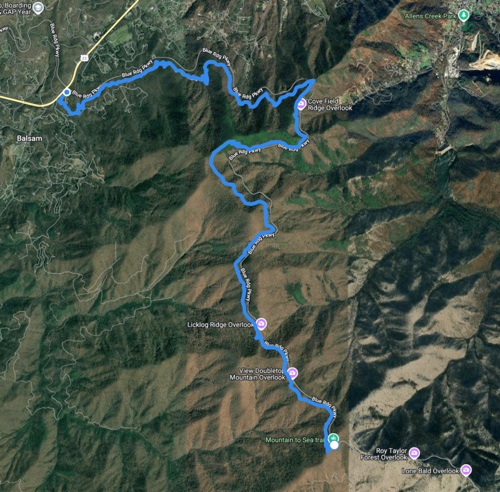 The route goes near several Blue Ridge Parkway overlooks–but views were scarce today.