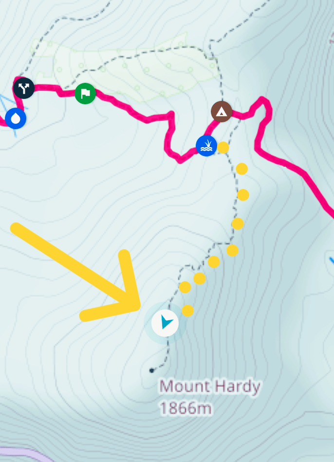 Finally back on-route, Rick is standing on the ACTUAL trail. We veered off to the left on the larger, seemingly more traveled path–but that was actually the Mount Hardy turn-off. We were supposed to “bear right” at this point. I hadn’t even noticed there was any trail junction here at all!
