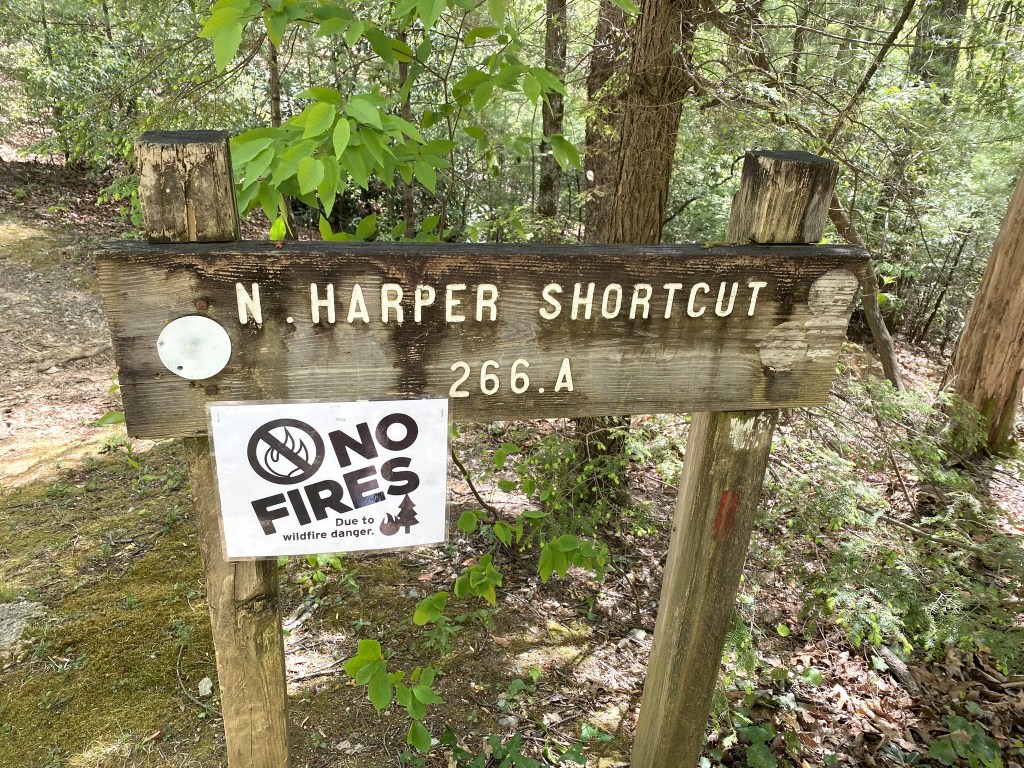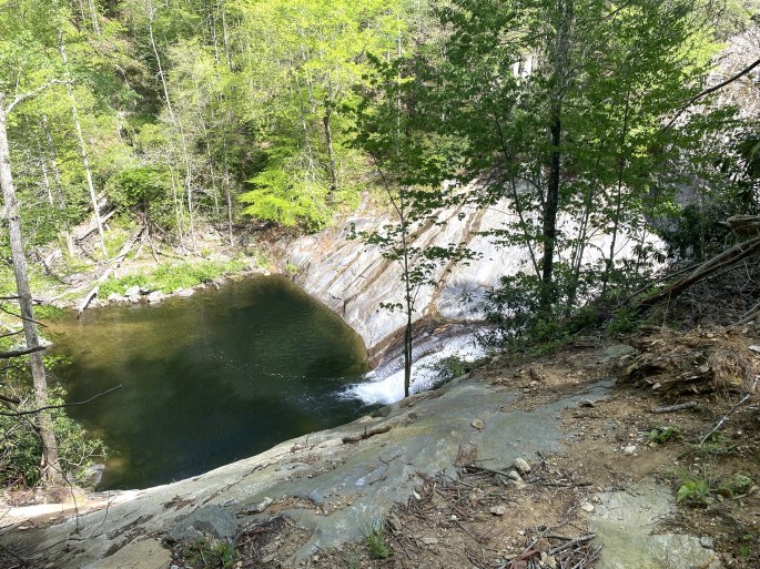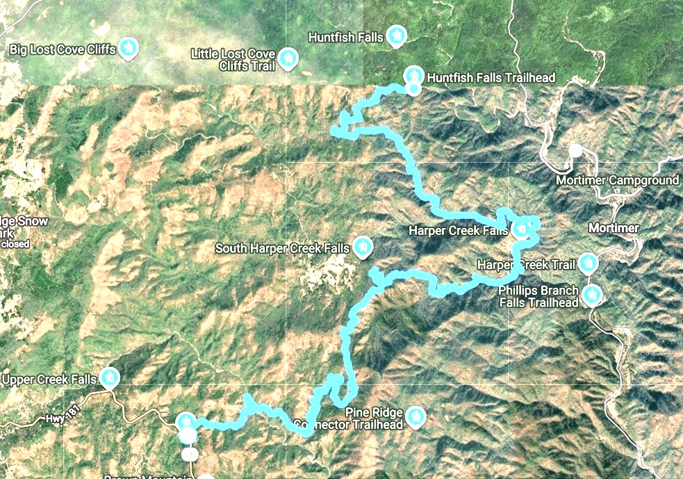 “Trail hugs a slope and rises over 30 yards above the creek as the gorge narrows. As it climbs the slope, a trail goes straight, following an old railroad bed. Within 300 yards, this trail ends at an overlook of Harper Creek Falls.”