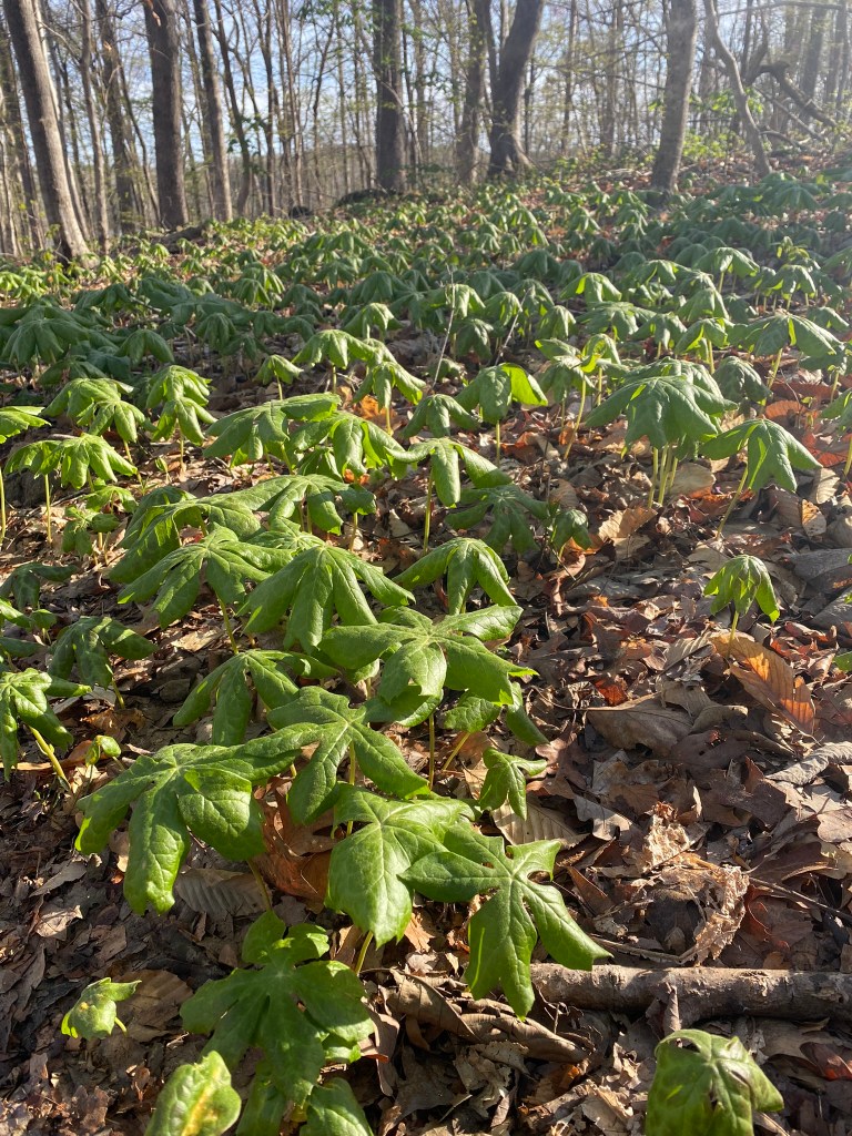 This is Mayapple (Podophyllum peltatum), also known as American mandrake or Ground lemon. This entire colony of plants has grown from a single root system.